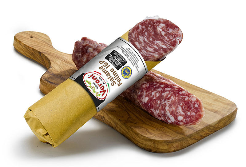 The Felino Veroni salami, IGP certified, takes its name from the town located in the typical Parmesan hills, and is made unique by its intense scent, very characteristic, and its soft flavour.